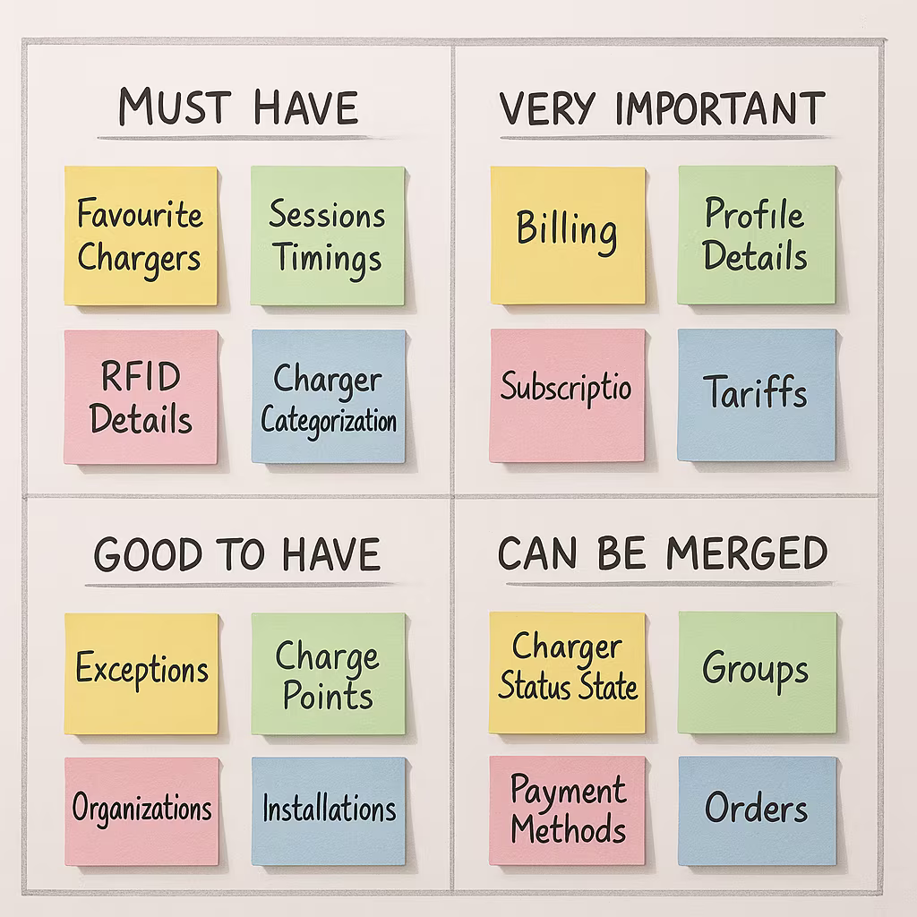 First, I pulled everything on the screens into one list and asked a simple question: who needs this, when, and why. Using sponsor-user input (drivers, real-estate managers, stakeholders), I cut duplicate or low-value data, merged rarely used views, and tiered the rest by task urgency. Drivers saw favourites, session timing, and RFID up front; managers got billing, subscriptions, and tariff controls one tap away. Clear labels and states replaced guesswork. The cleaned information model let us introduce differentiators—charger categorization, status hubs, and quick-actions—without adding noise. Net effect: less to think about, faster first charge, and a product that feels useful.